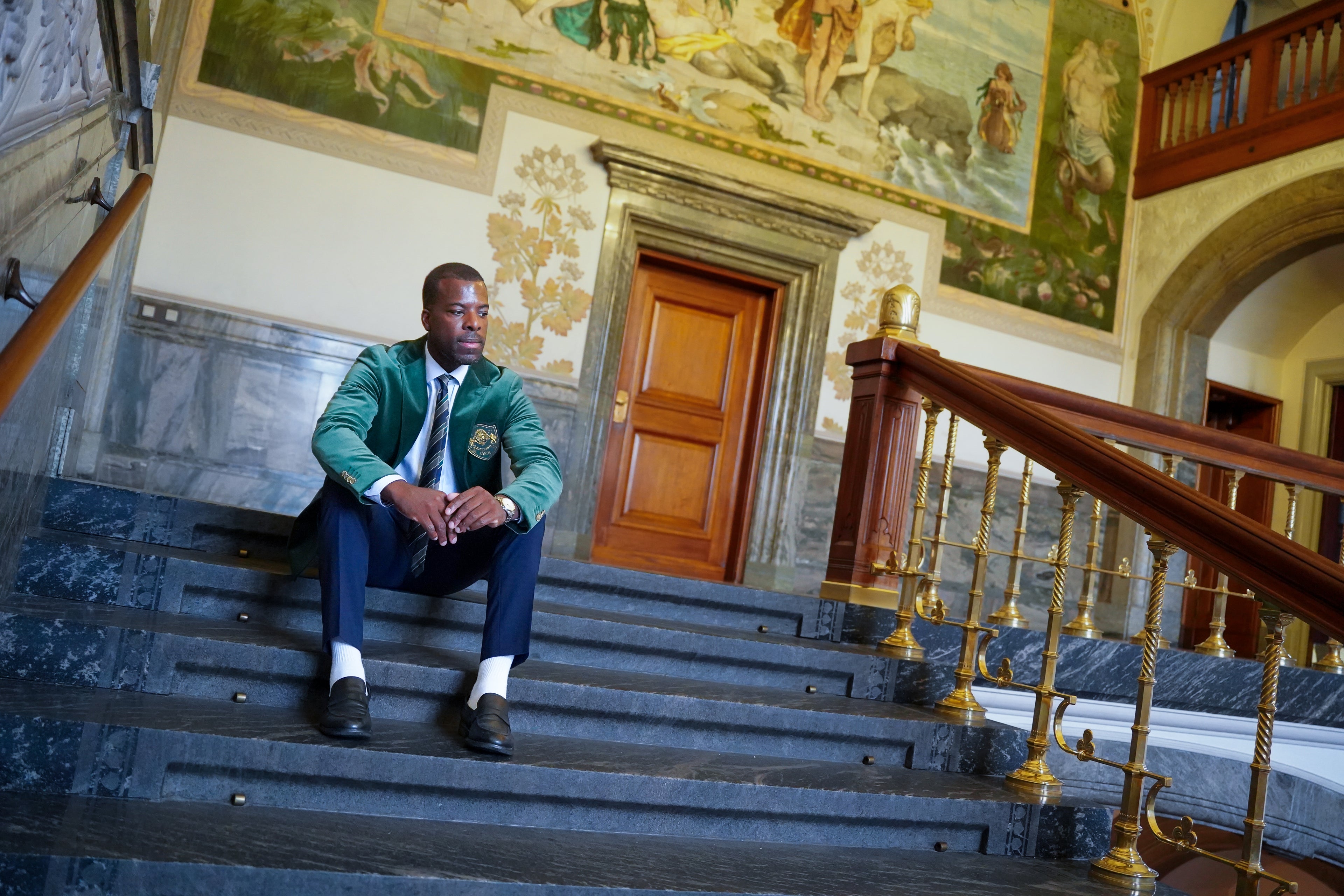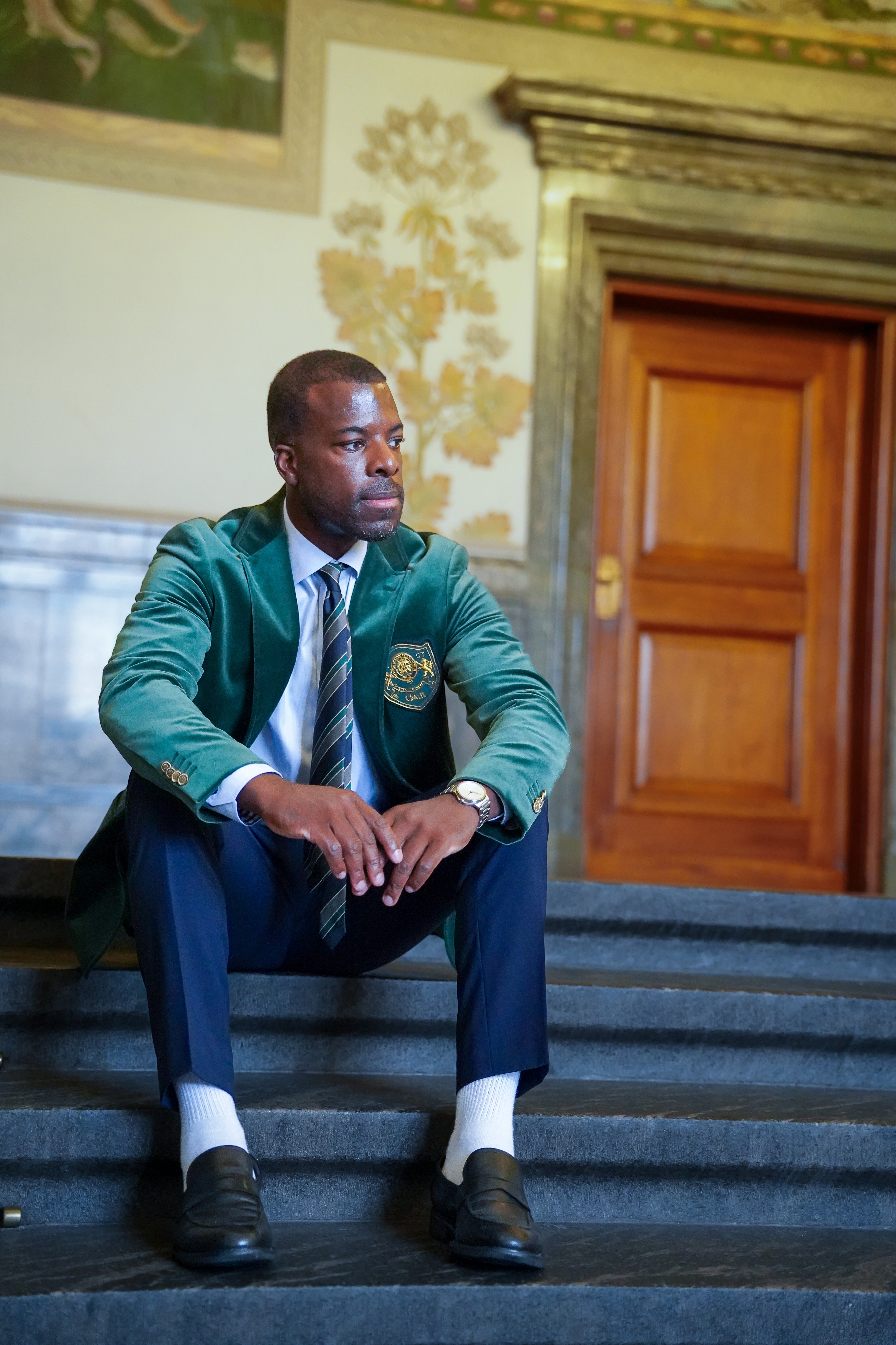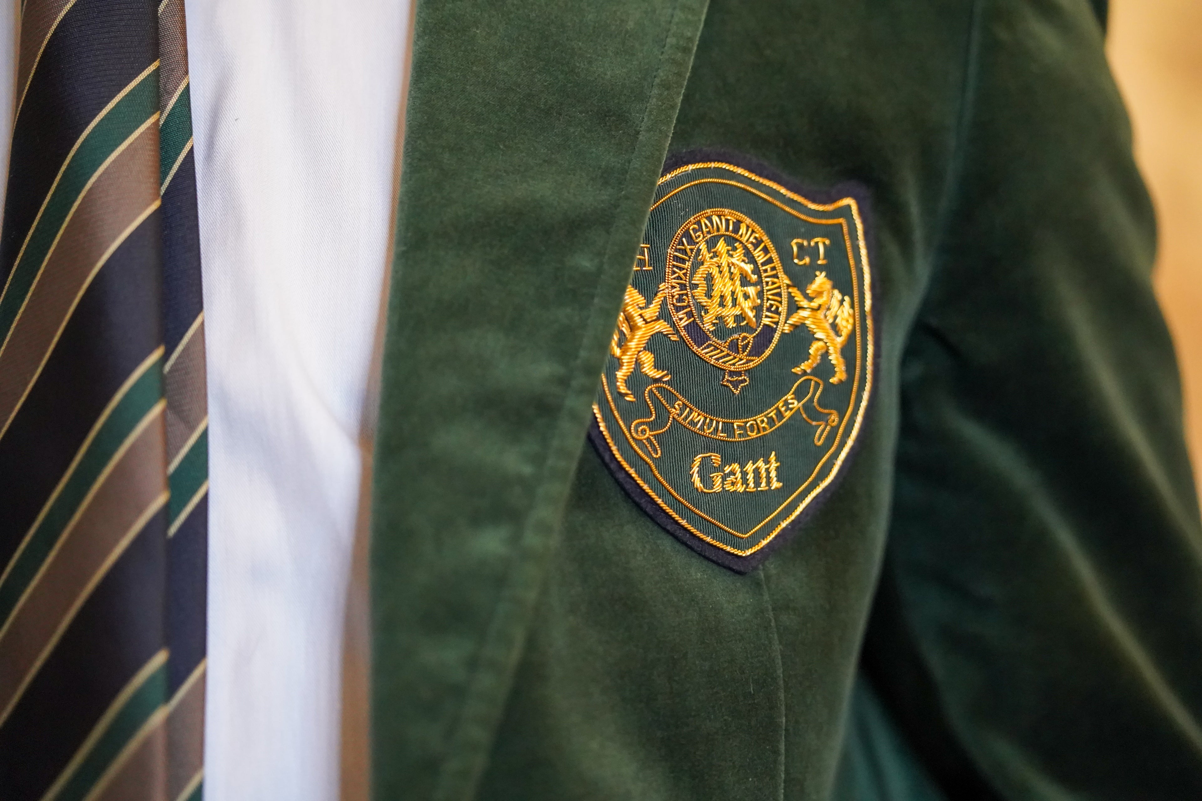 Im Mittelpunkt steht der dunkelgrüne Gant-Velours-Blazer mit gesticktem Wappen – eine klare Referenz an die amerikanischen Universitätsjacken, die die bestgekleideten Studenten in Harvard, Princeton und Yale in den 1950er und 60er Jahren trugen. Die Jacke ist Statement und subtiles Detail zugleich. Sie signalisiert Ambition, aber auch Stilbewusstsein.