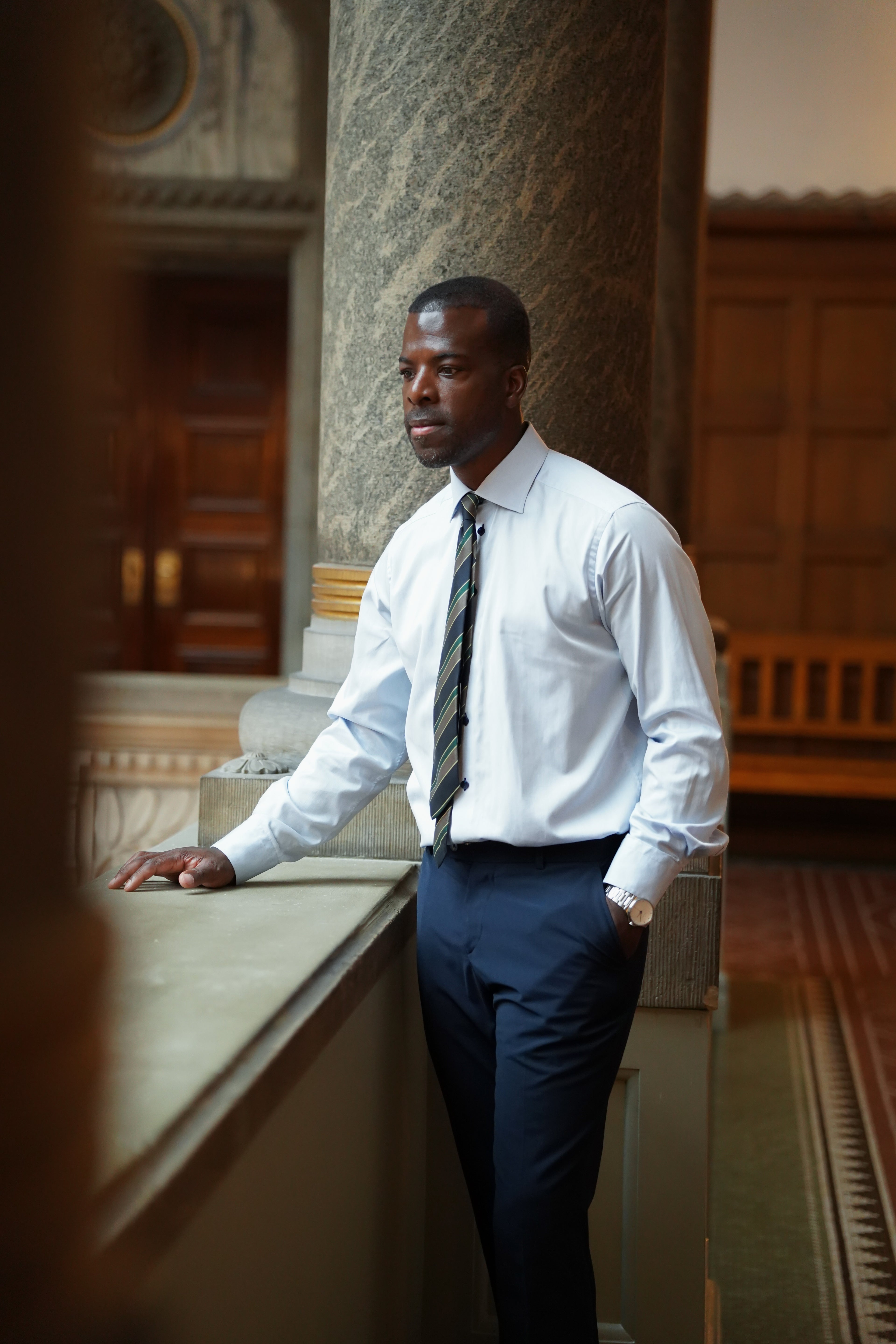Das weiße Hemd und die klassische Regimentskrawatte bilden einen scharfen, aber dennoch traditionellen Kontrast. Es ist formell, ohne steif zu sein. Ein uniformierter Ausdruck – mit Persönlichkeit.