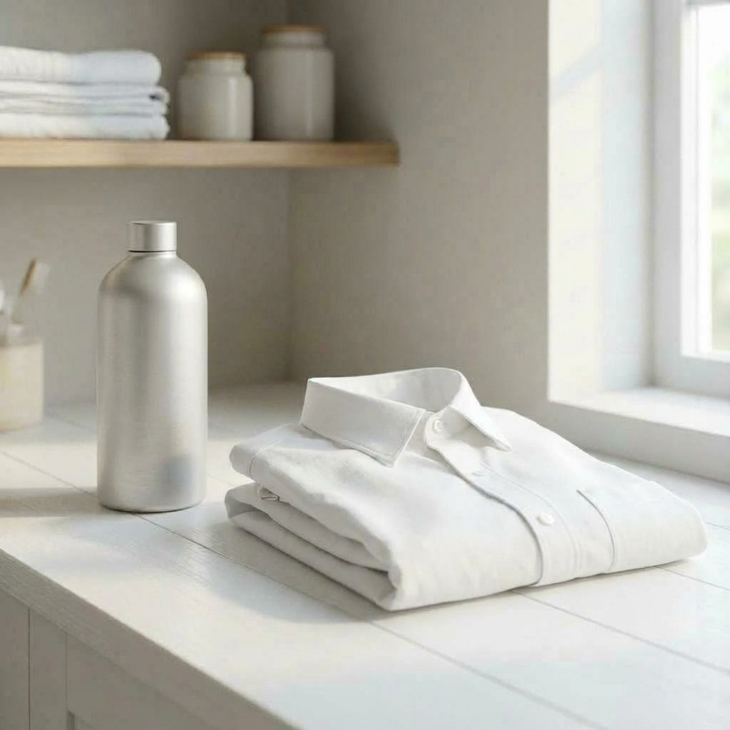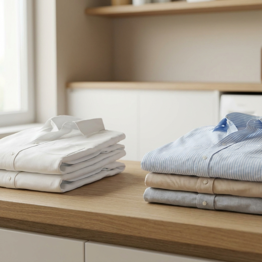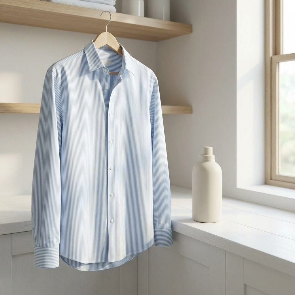 Wash white shirts separately at 30–40°C without fabric softener. Avoid chlorine-based detergents and hang the shirt up immediately after washing.